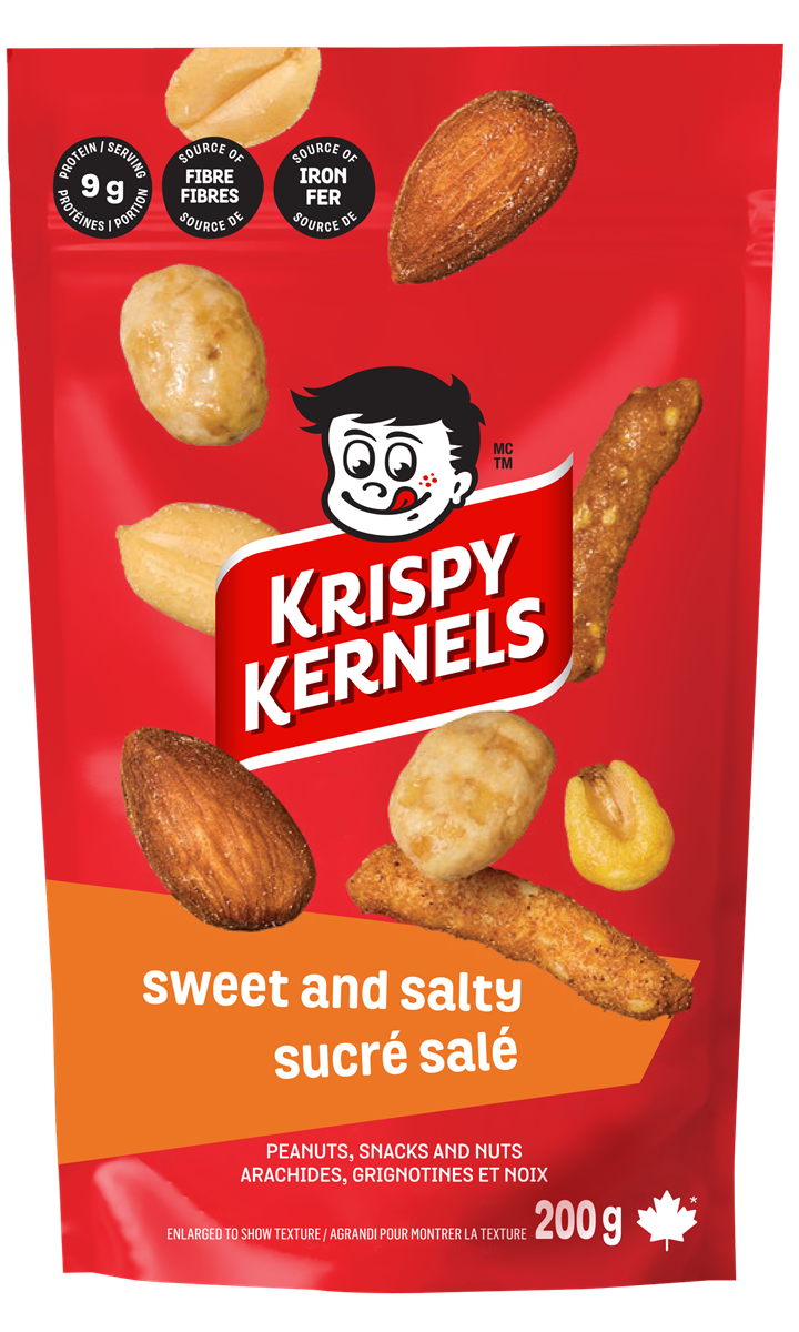 Butter flavour roasted peanuts, Salted peanuts, Toasted corn, Honey sesame stick, Cajun sesame sticks, Salted almonds.